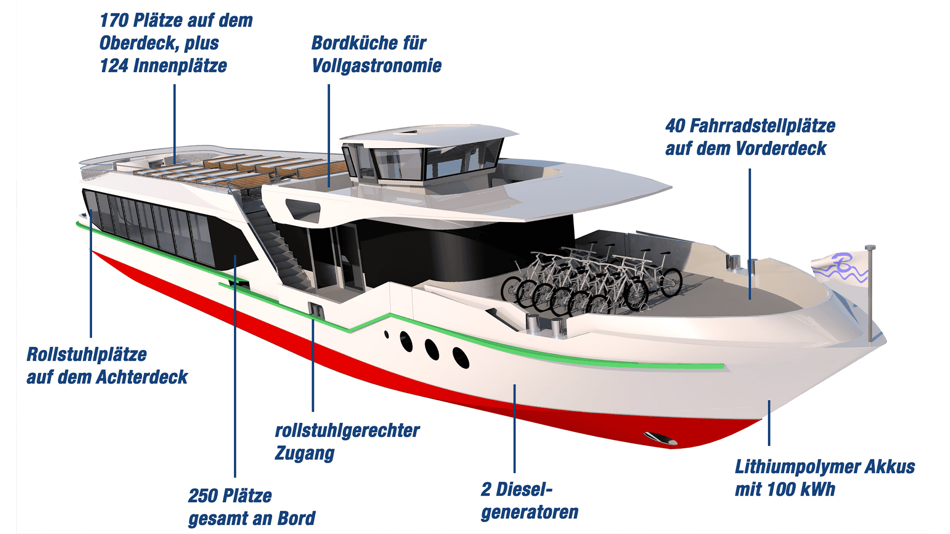 Dieses innovative Schiff ist das Neueste der Flotte und wird mit seinem Elektroantrieb Maßstäbe in der Fahrgastschifffahrt setzen. Hochmodern ausgestattet bietet es einen barrierefreien Zugang zum Achteraußendeck und bietet zudem die Möglichkeit der Fahrradmitnahme auf dem Vorschiff. In den Abendstunden können Sie dieses Schiff für Ihre Veranstaltung mieten.